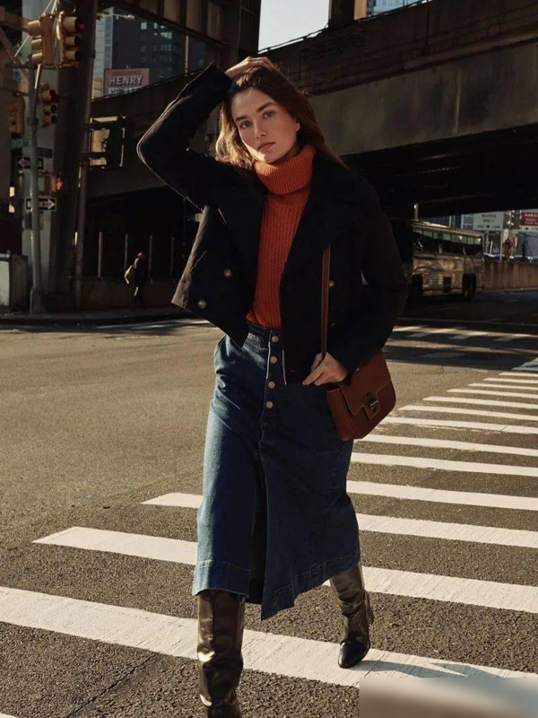你可以选择一件简约的短款针织外套,搭配一条优雅的A字裙, 外套的颜色与裙子相互呼应,营造出和谐统一的视觉效果,配合高跟鞋增加整体的气场,成为约会聚会场合的主角。